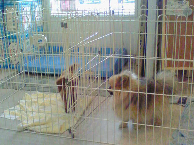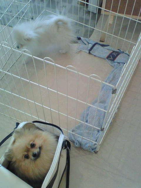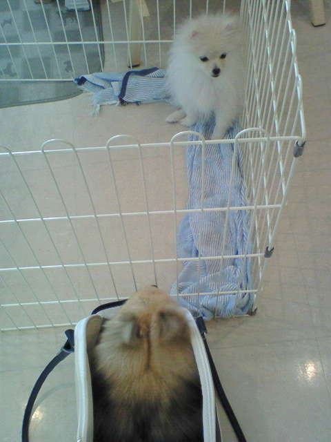 ちょっとした遊び心でエリを白ポメの入ってたケージに入れさせてもらう。
