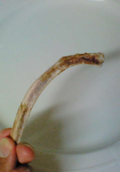 食べているエリ。手を伸ばすと慌てて骨持って逃げる。