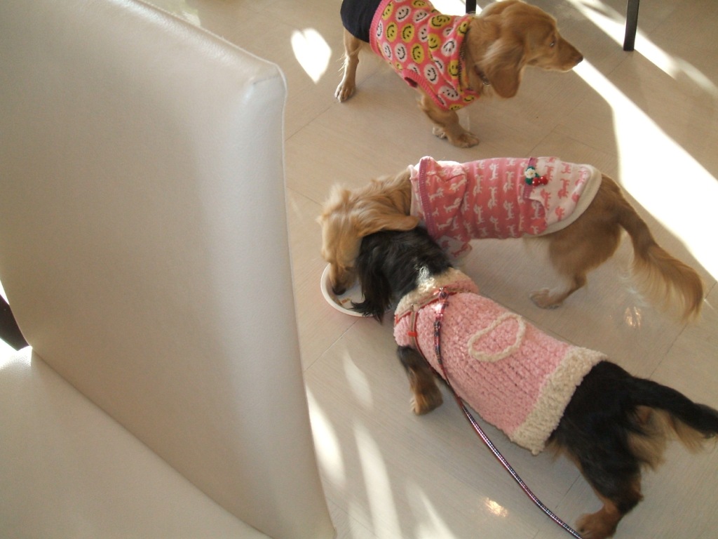 犬のご飯をちょっと残して帰られた方が居られたので、そのあまりを店の中央に持って行ってみるとやはり争奪戦が・・・