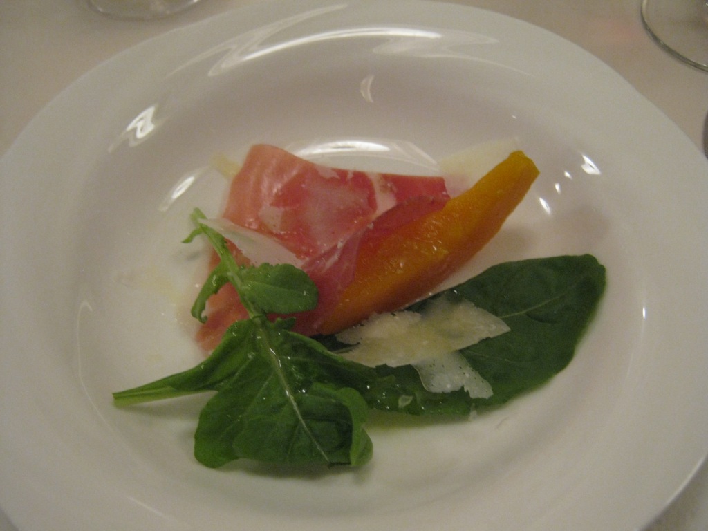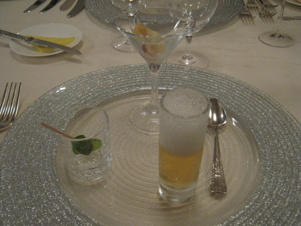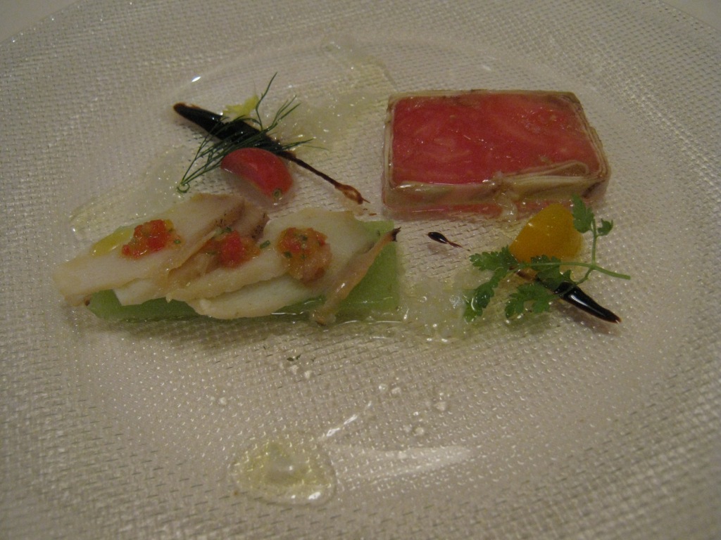 次が前菜 左下はアワビで下の緑色が青リンゴのなんとか