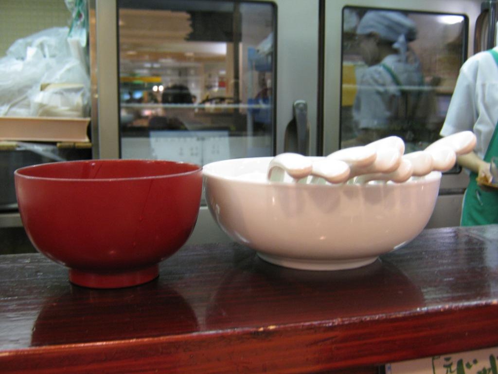 食い方を教えて貪りつく 最近は、卵の殻を入れるこんな丼と、チータン飲むレンゲが置いてあるが・・・