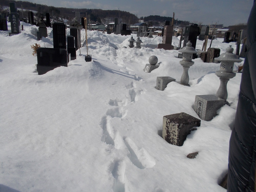 目的の墓までたどり着けないかと思ったが・・・ シュンが無謀にも雪乗りして歩き、根性で墓までたどり着いた