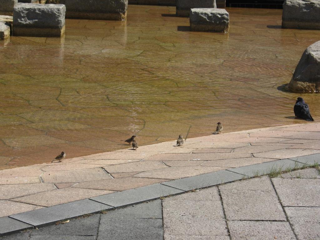電線が無い中、スズメたちは池で水浴びをしていた