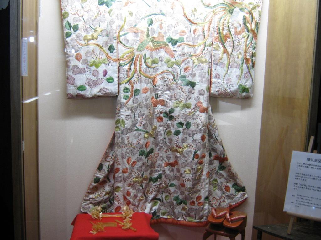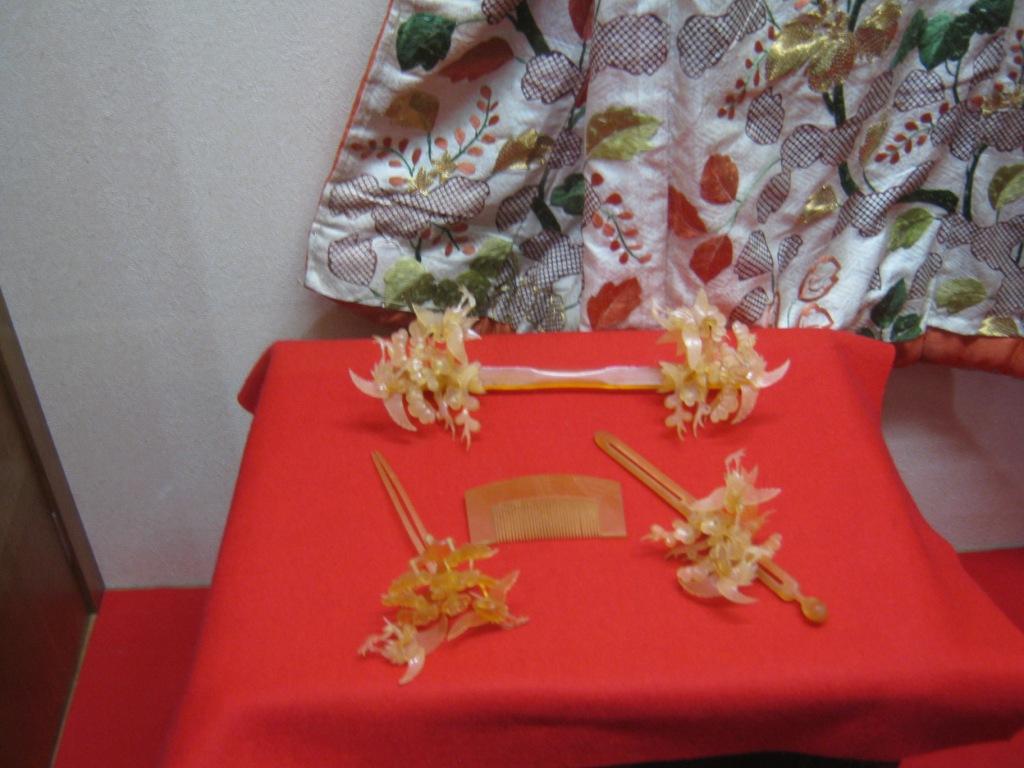 観光所でみた結婚式の衣装 随分古いものであるが、その側においてあったべっ甲のかんざしに目が行く