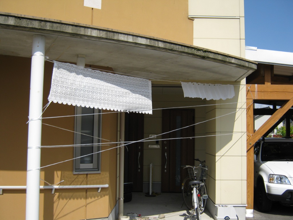 左のカーテンがめくれないように下の紐と結んでおいたし