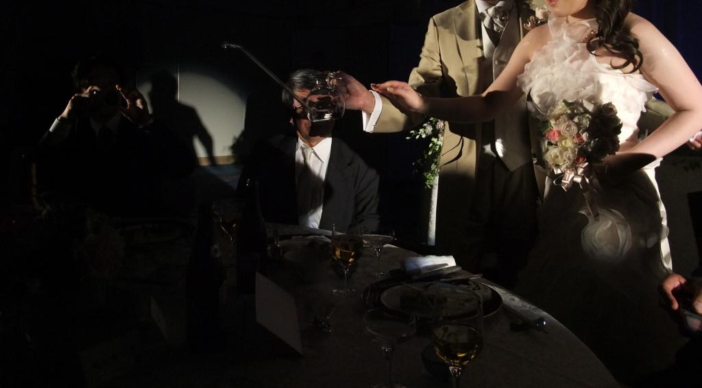 終わりに高砂の横で新郎新婦が揃って、件の不審な汁を滝のように落とす何かに注ぐ