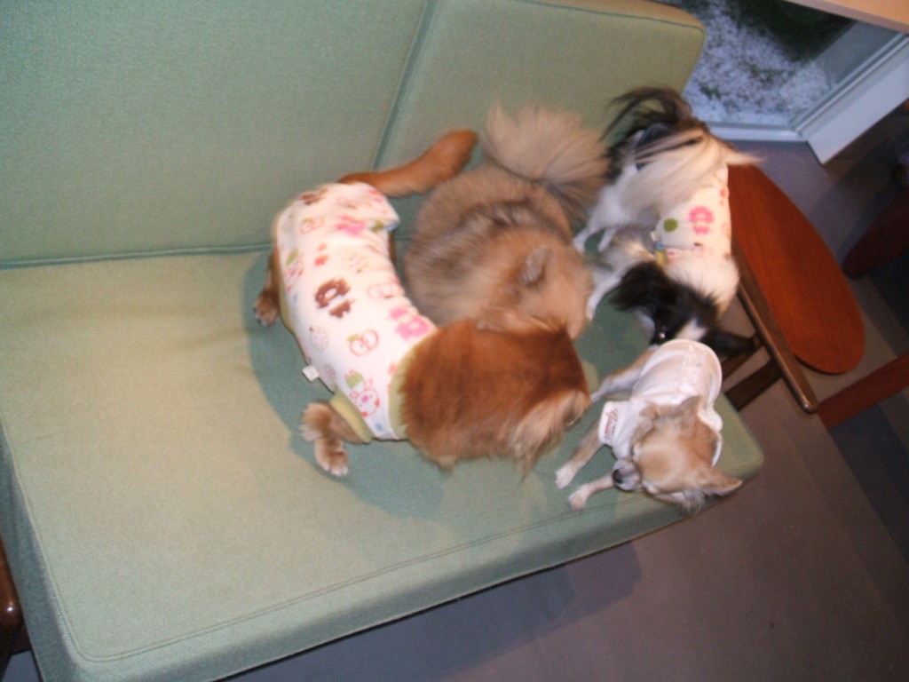 こーなったらもう全員の写真撮ろうと犬達全部をソファーに乗せてみるが、ダックスはソファー乗り降り自由だったり、エリはJOJO君にしつこく付きまとわれたり、たくさんの犬に恐がったりで、皆てんでバラバラに・・・誰かの上乗ってるぞ、エリ。